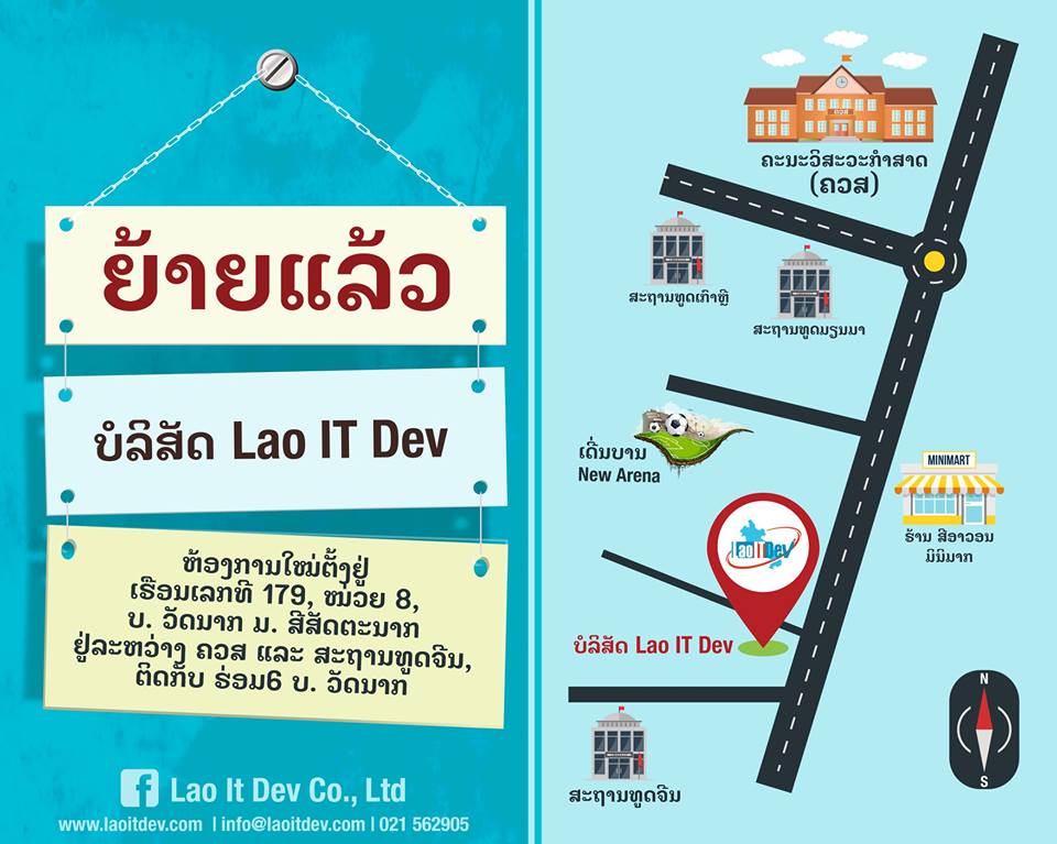 ກ້າວເຂົ້າສູ່ປີ 2018 ຫ້ອງການບໍລິສັດ ລາວໄອທີພັດທະນາ ຈຳກັດ ກໍໄດ້ຍ້າຍໄປສູ່ສິ່ງໃຫມ່ໆ ພວກເຮົາໄດ້ຍ້າຍຈາກຫ້ອງການເກົ່າທີ່ຢູ່ບ້ານໂພນຕ້ອງສະຫວາດ ມາຢູ່ທີ່ບ້ານວັດນາກ ຈຶ່ງແຈ້ງມາໃຫ້ທຸກໆຄົນຮັບຮູ້.